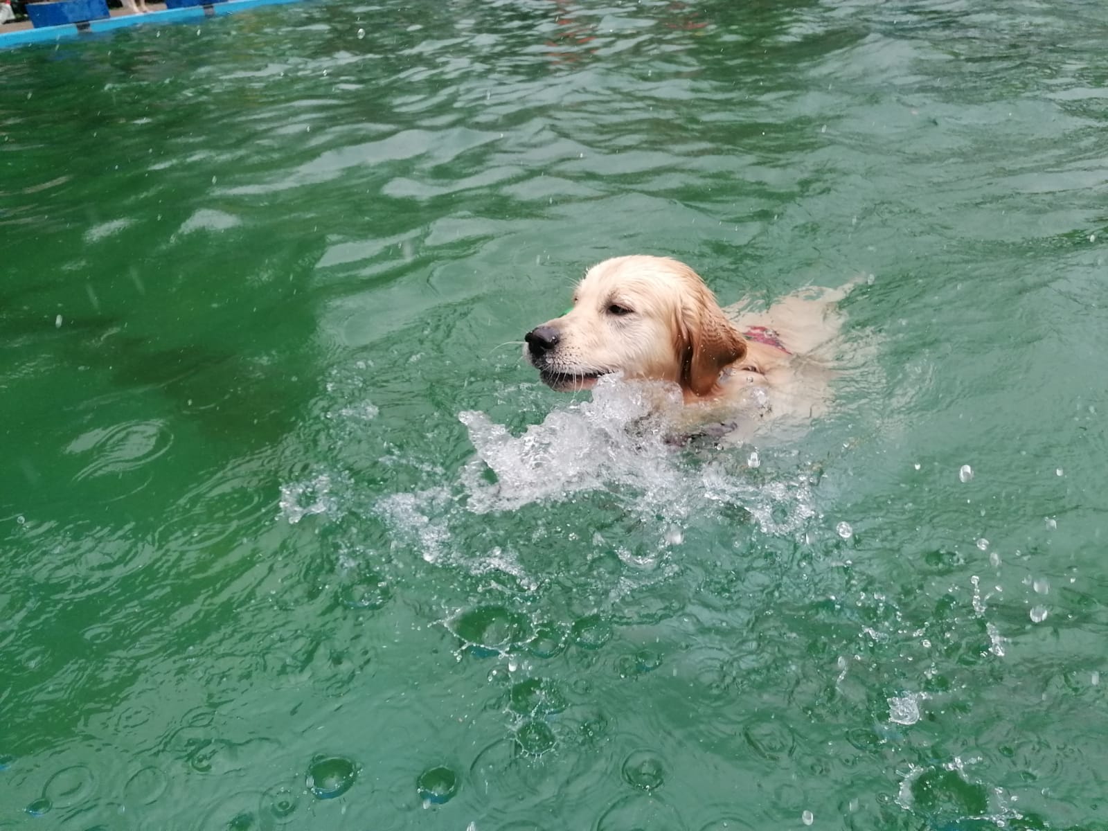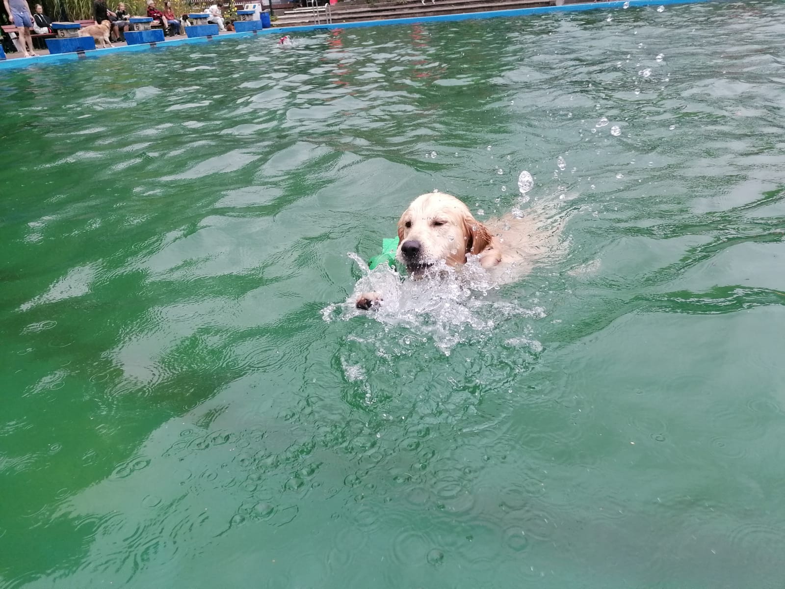 Nun reichte es mir aber auch mit dem tiefen Becken. Meine Menschen warfen mein Spielzeug allerdings noch ein drittes Mal ins Tiefe – Nö, nicht mit mir. Ich wollte lieber schauen, was so am Beckenrand abging – so viele tolle Hunde, die meiner Spielaufforderung nachkommen wollten – da geh ich doch nicht nochmal tauchen! Außerdem war da eine Labrador-Hündin, die mein Spielzeug ohnehin rettete, daher gab es keinen Grund für mich, nochmal ins Profi-Becken zu springen. Und nass wurden wir alle aktuell auch von oben – es regnete in Strömen. Einige Zweibeiner suchten Schutz unter einem Dach – wir Retriever werden nie verstehen, wie man diese wohligen Regentropfen nicht genießen kann! Ich liebe Regen.